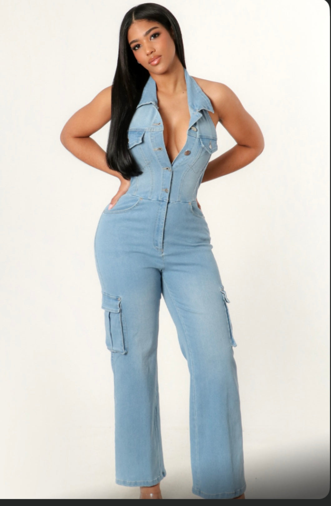 Turn heads in this effortlessly cool multi-pocket halter jean jumper, designed to blend street-style edge with feminine flair. Crafted from premium denim, this one-piece features a halter neckline that adds just the right amount of sass, while the fitted bodice snatches the waist before flowing into dramatic wide-leg pants for that bold, elongating silhouette.