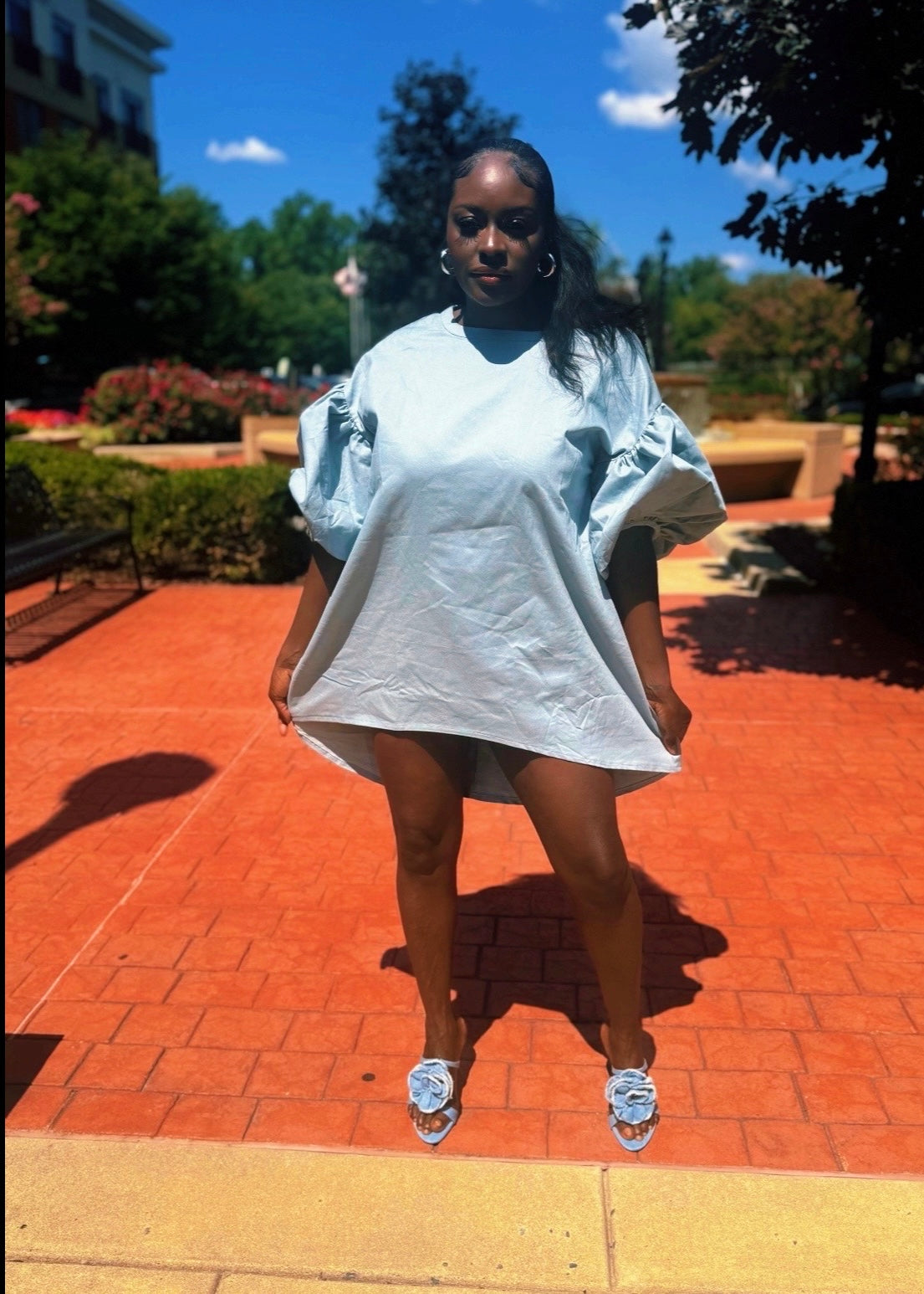 This dress is a statement piece! Puff sleeve jean with mesh finishing inside of sleeve. Stretchy and true to size. Model wears a size medium