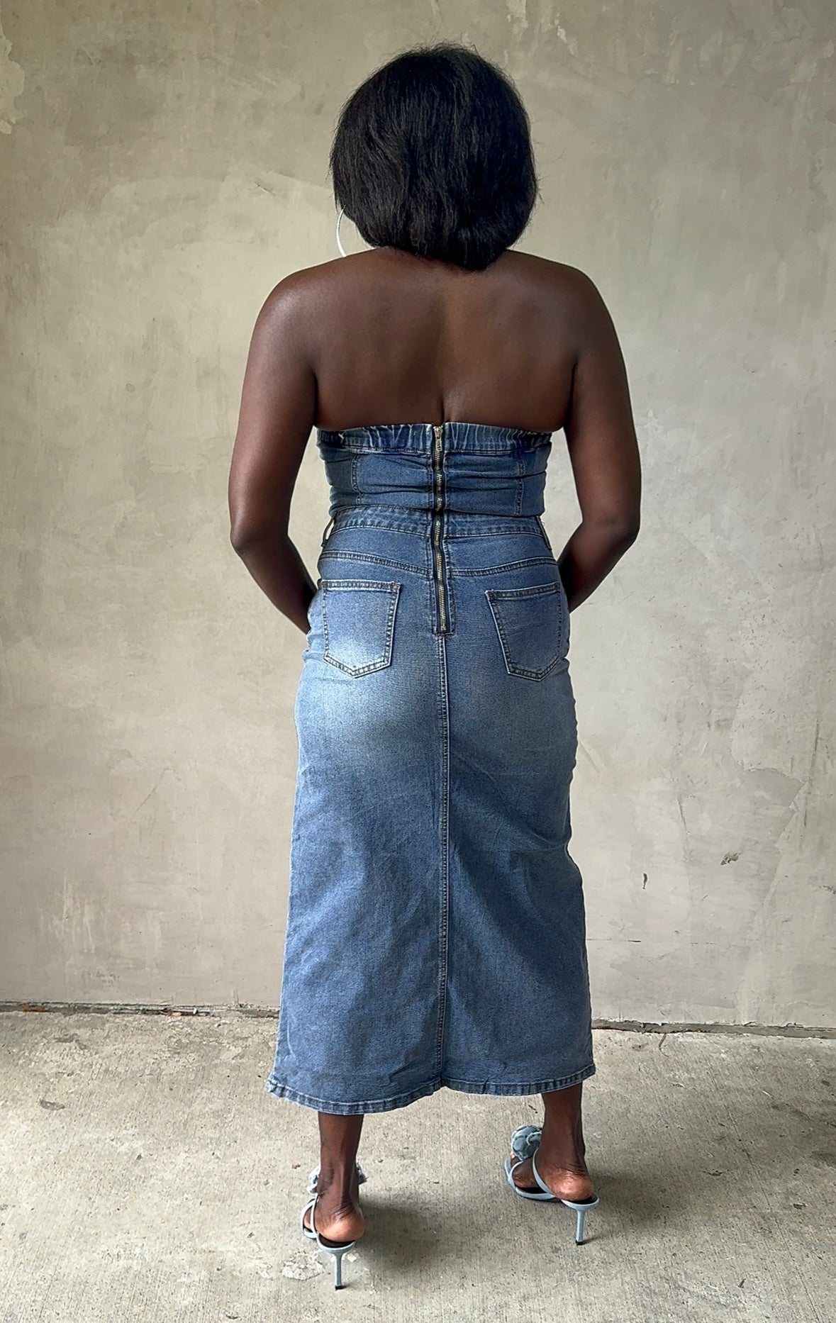 Super cute and flirty jean dress! Dress has a slight down the middle and zipper finishing. Could be dressed with a flirty heel or down with your favorite tennis shoe. Extremely stretchy. Model wears a medium